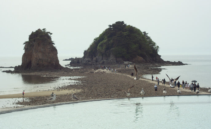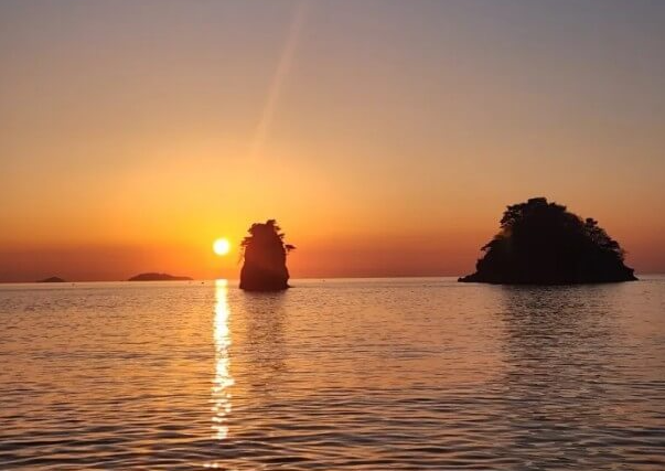태안 튤립축제 행사장과 불과 도보 10분 거리! 노을이 아름답기로 유명한 이곳은 두 개의 바위 사이로 해가 지는 풍경이 장관을 이룹니다.